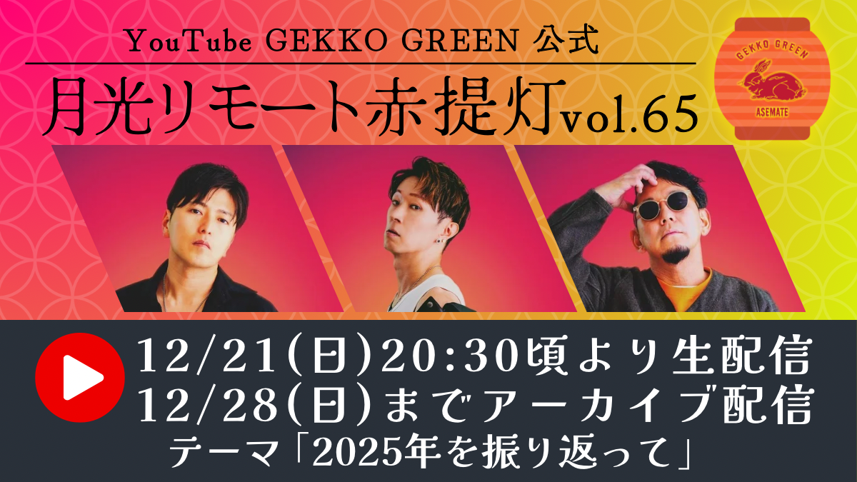 FANCLUB Video Media 12/21(日)20:30頃 汗メイト限定『月光リモート赤提灯 vol.65』生配信決定 2025 年 12 月 2 日 汗メイト限定「月光リモート赤提灯」生配信が決定いたしました。 2025/12/21(日)20:30頃生配信 YouTube:GEKKO GREEN 公式 汗メイト限定「月光リモート赤提灯 vol.65」