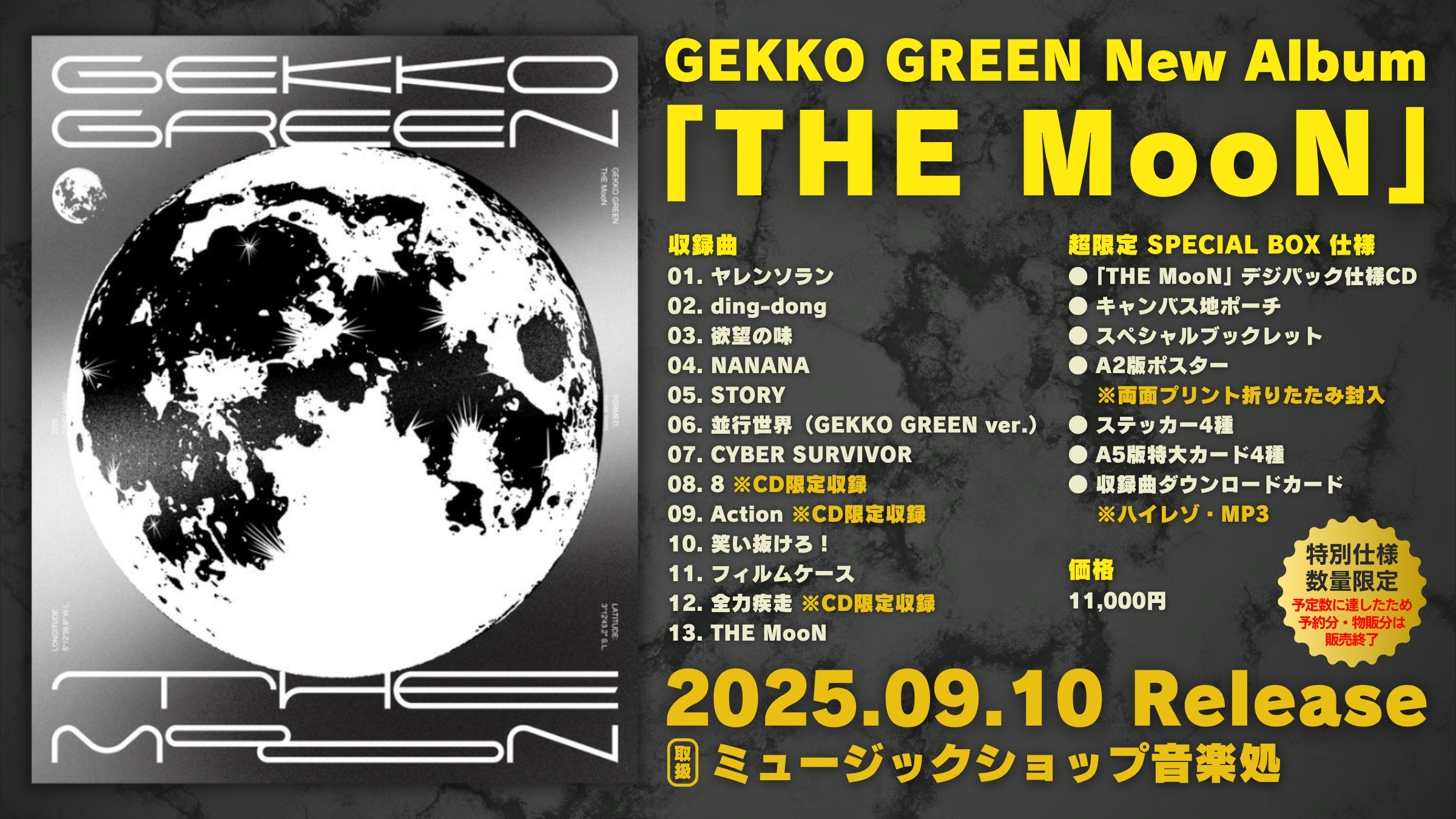 ◆ GEKKO GREEN HP予約[ライブ会場受取予約]受取一週間前まで受付 ※予約分は予定数に達したため受付終了いたしました。現在、ミュージックショップ 音楽処でのみ数量限定取扱中です。物販での取扱はございません。