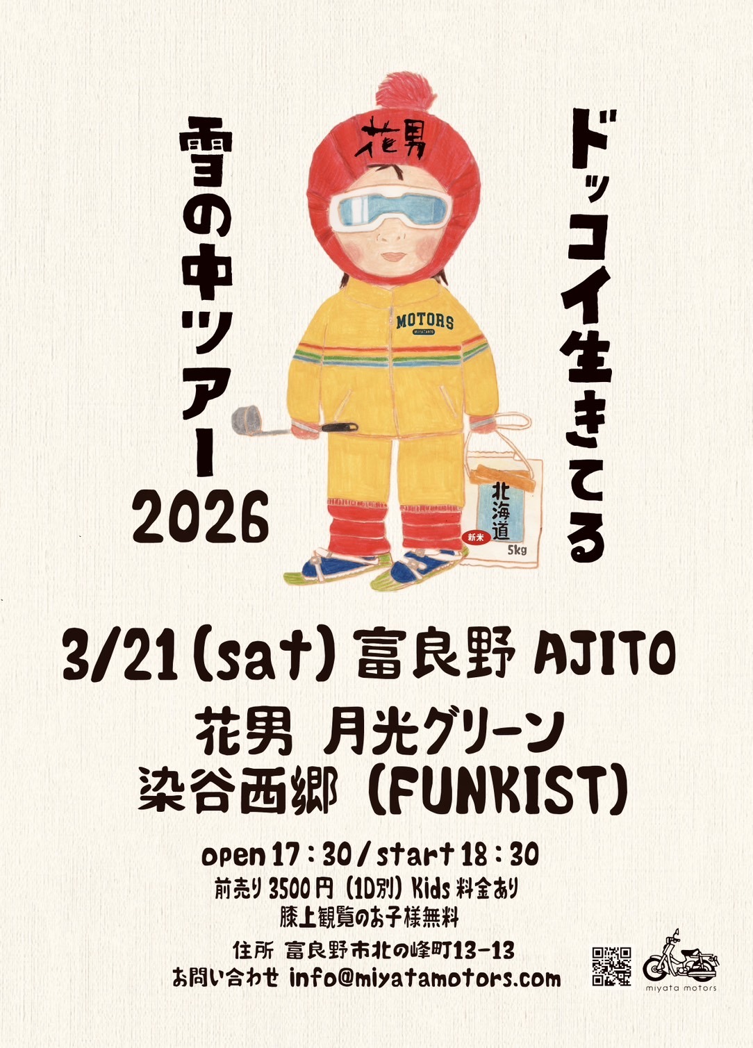 Live 3/21(土) 富良野『ドッコイ生きてる雪の中ツアー2026』 2026 年 1 月 6 日 花男さんの北海道ツアー富良野公演に出演いたします。 2026/03/21(土)18:30開演 会場:富良野 AJITO 「ドッコイ生きてる雪の中ツアー2026」